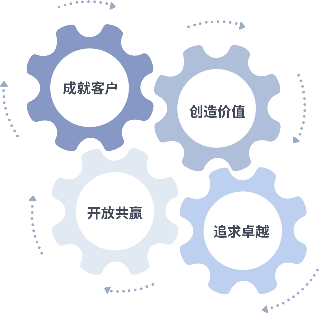 成就客户是一切决策的出发点,,,创造价值是衡量所有工作的标准,,追求卓越是我们做事做人的态度,,,,开放共赢是我们的格局也是最终的结果。。。价值观的齿轮环环相扣,,,,推动着组织里的每个人不断向前。。。